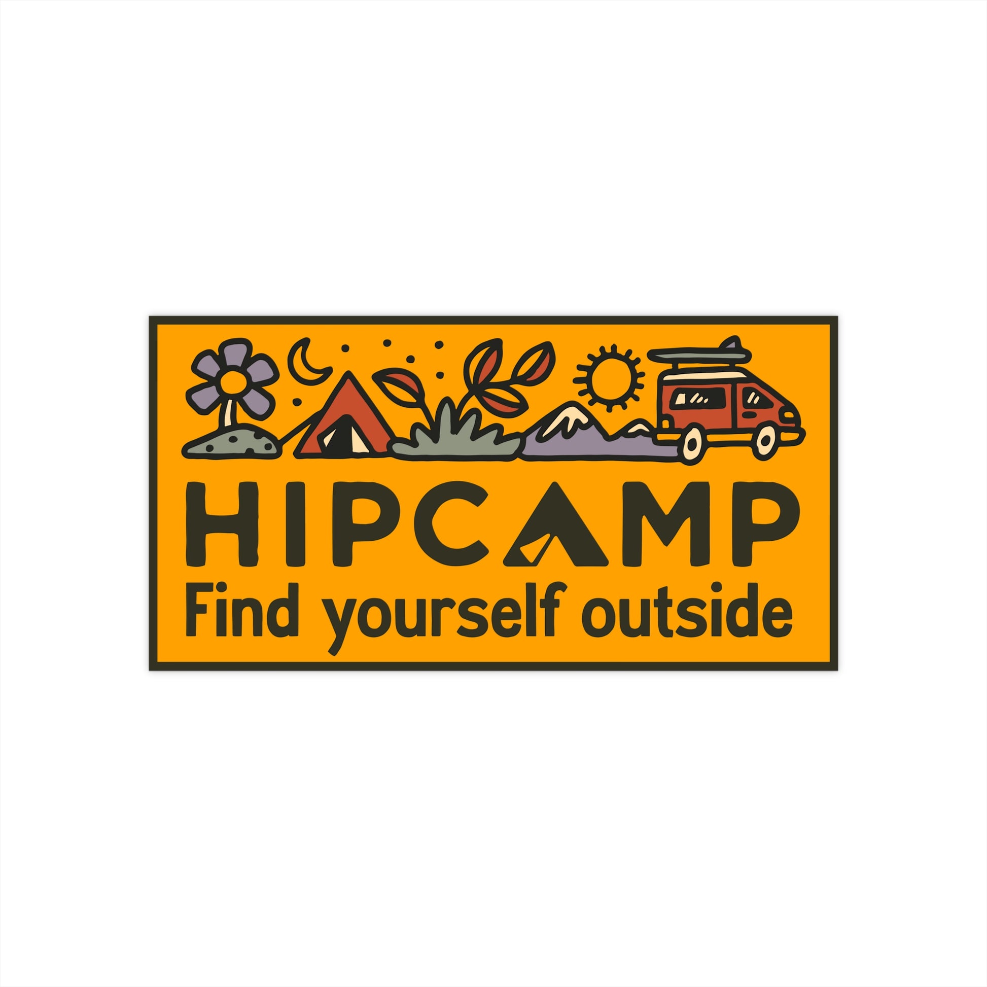 Hipcamp's "Find yourself outside'" Bumper Sticker in marigold.